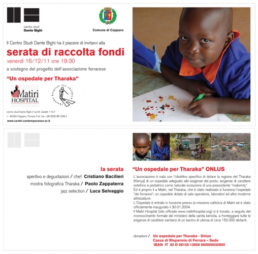 TharakaÈ dicembre, è arrivata la fine dell’anno 2011 e, come avviene, da quattro anni a questa parte, il Centro Studi Dante Bighi di Copparo riunisce attorno a se i propri amici, sostenitori, soci e gente munifica per una serata di beneficenza dedicata ad un Ospedale Kenyota. Chiude in questo mese anche l’anno delle attività artistiche con la mostra fotografica di Paolo Zappaterra che, oltre ad essere dedicata al linguaggio delle immagini è, testimonial della serata benefica. Gli scatti fotografici dell’autore Zappaterra, in questa occasione vivido reporter, narrano di un viaggio in Kenya, nella regione del Tharaka, dove un gruppo di ferraresi ha eretto una struttura ospedaliera con sale operatorie, laboratori analisi e moderne attrezzature. Il Tharaka Matiri Hospital for Children, inaugurato il 30 gennaio 2004, è interno alla missione cattolica di Matiri. L’ospedale è nato sotto l’egida del ministero della sanità kenyota per dare assistenza ad una popolazione locale di 150.000 persone in materia di ostetricia, pediatria e maternità.