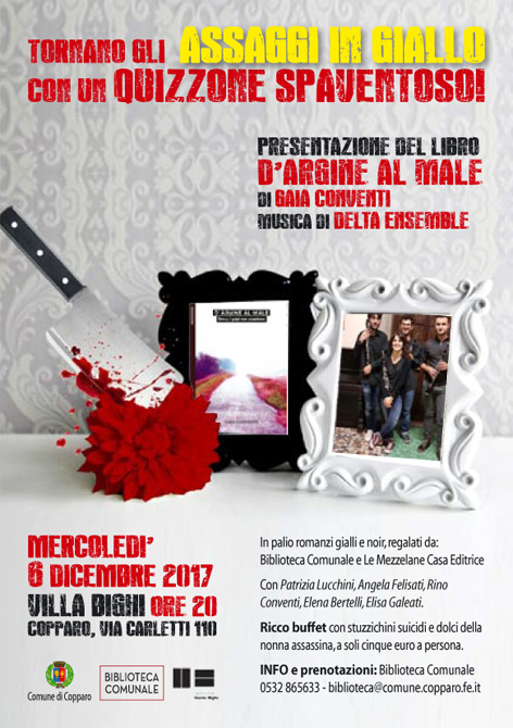 Assaggi in giallo nasce da un’idea della Biblioteca Comunale di Copparo e trova in Villa Bighi una location perfetta in cui ambientare enigmi da risolvere. Il pubblico sarà il vero protagonista di questa serata animata da letture, uno spaventoso quizzone a premi (rigorosamente in libri scelti e offerti dalla Biblioteca) e conversazioni con Gaia Conventi, organizzatrice dell’evento e autrice di “D’argine al male” (Mezzelane casa editrice)
