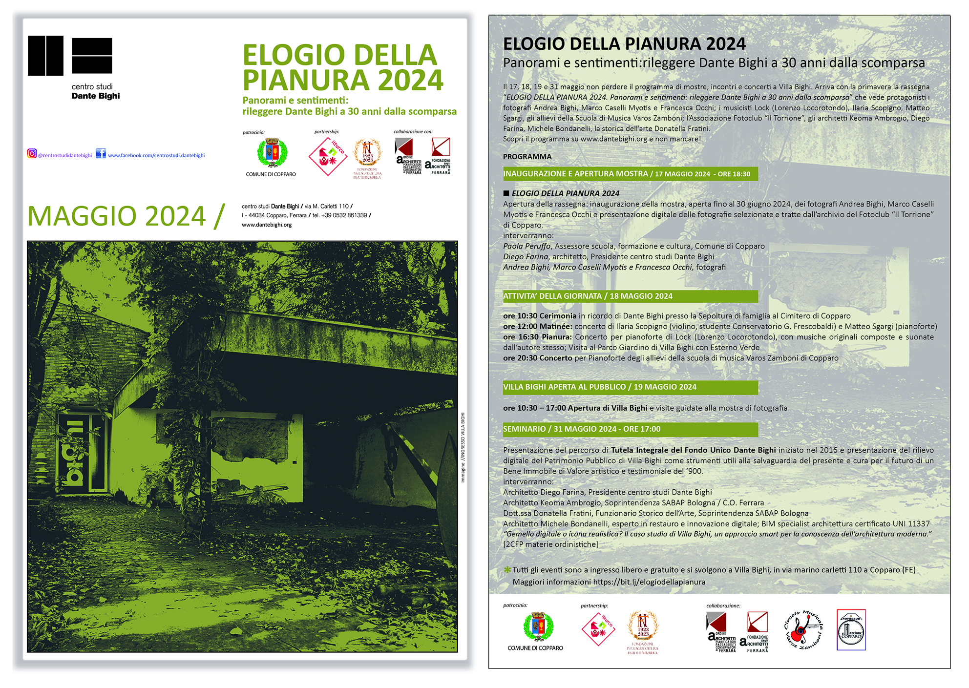 Proprio il libro oggetto ha ispirato il titolo e i contenuti della rassegna a partecipazione libera e gratuita “Elogio della pianura 2024” che comprende una mostra di fotografia, concerti, visite guidate a Villa Bighi e un incontro dedicato alla presentazione del percorso di Tutela Integrale del Fondo Unico Dante Bighi iniziato nel 2016 e tutt’ora in corso di perfezionamento in collaborazione con la Soprintendenza Archeologica, Belle Arti e Paesaggio per la città metropolitana di Bologna, Modena, Reggio e Ferrara.